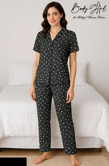 Body Girl Premium Black Multicolor Floral Linen Pajama Set – Elegant & Comfortable Women’s Nightwear