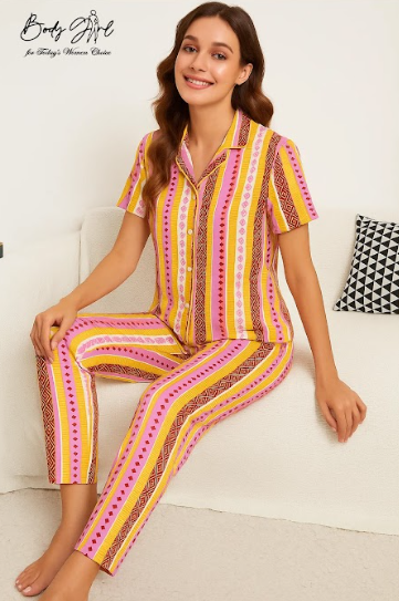 Body Girl Premium Multicolor Striped Linen Pajama Set – Vibrant & Comfortable Women’s Nightwear