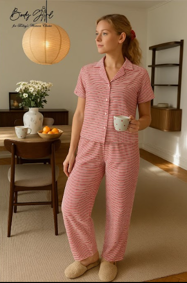 Body Girl Premium Red & White Striped Linen Pajama Set – Timeless, Cozy & Elegant Women’s Nightwear