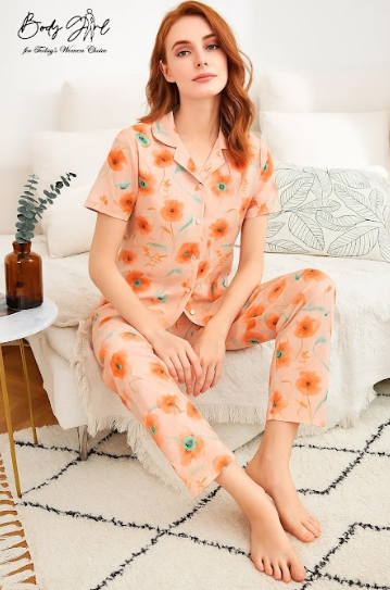 Body Girl Premium Orange Floral Linen Pajama Set – Elegant & Comfortable Women’s Nightwear
