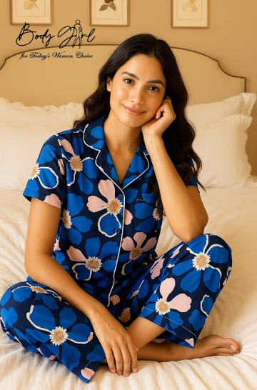 Body Girl Premium Blue Bold Floral Linen Pajama Set – Stylish & Comfortable Nightwear for Women