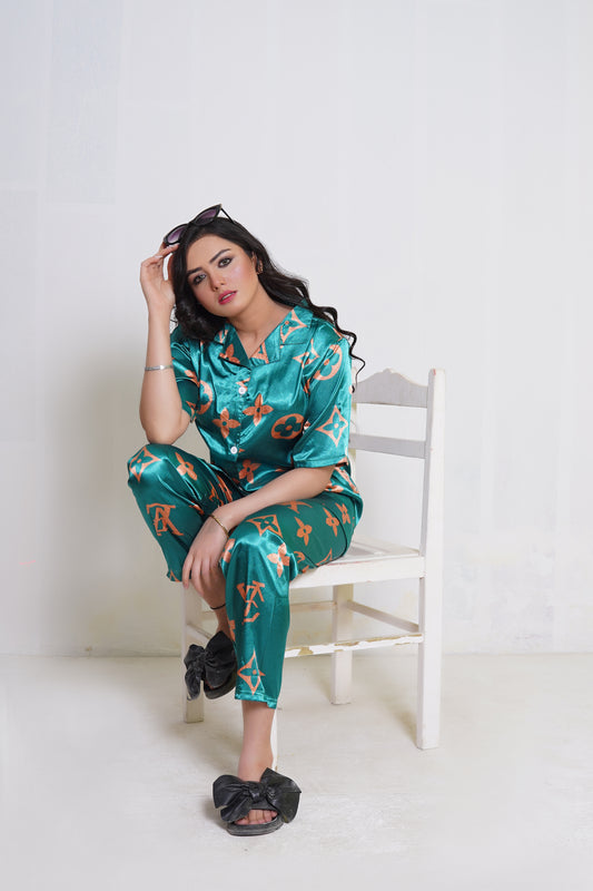 Body Girl Luxury Satin Pajama Set – Green & Gold Printed Nightwear